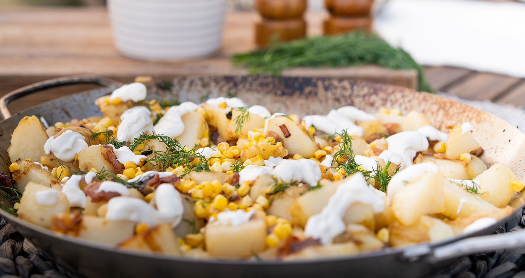 Den klein geschnittenen Dill darüberstreuen und in einzelnen Schüsseln mit Sour Cream darauf servieren.