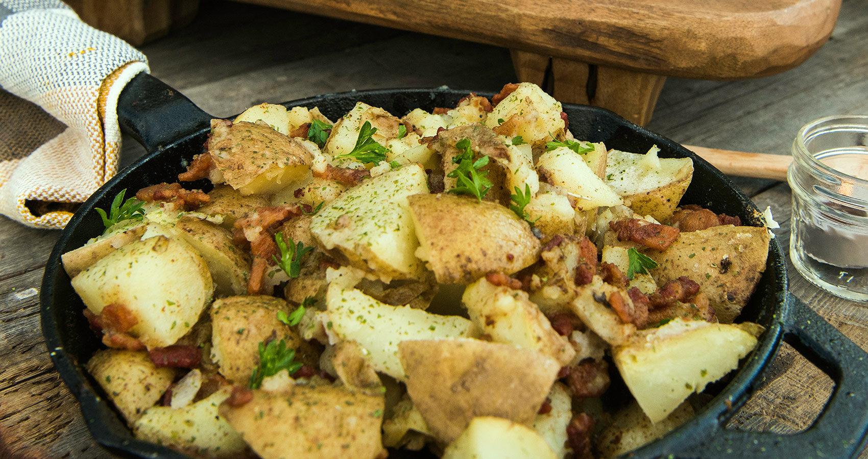 Dieses Rezept für gegrillten Kartoffelsalat ist besonders gut, da die gusseiserne Pfanne direkt auf dem Grillrost verwendet werden kann.