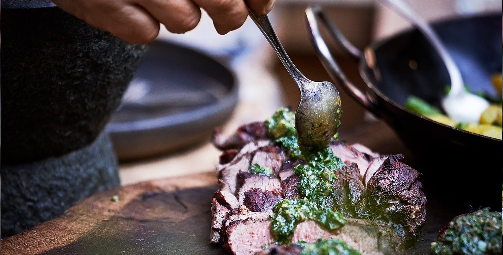 Dieses Rezept besteht aus diesen wenigen Zutaten, inklusive Rehkeule und wird mit Salsa Verde serviert.